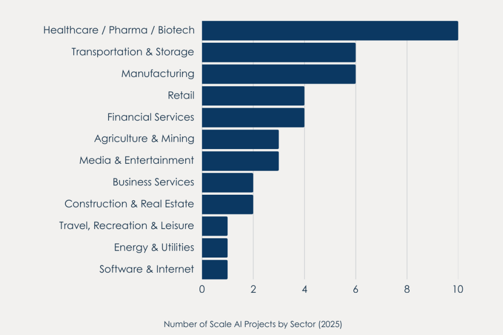 - Transport, Supply Chain & Manufacturing: Core to Scale AI’s mandate, with consistent 30–40% funding across mid- to large-scale projects.